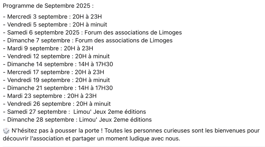 Dans notre précipitation à préparer le forum des associations et le weekend Limou’jeux nous avons oublié de mettre en ligne le programme du mois de septembre . voila qui est fait !