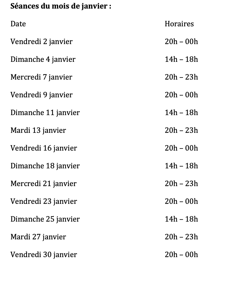 Retrouvez ci-dessous le calendrier de nos séances du mois de janvier 2026.